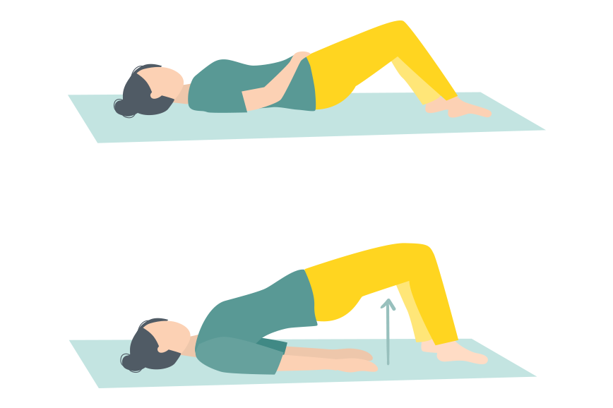 Поддържайте същата позиция като в Упражнение 4. Мост, със същото свиване на тазовото дъно при равномерно дишане.